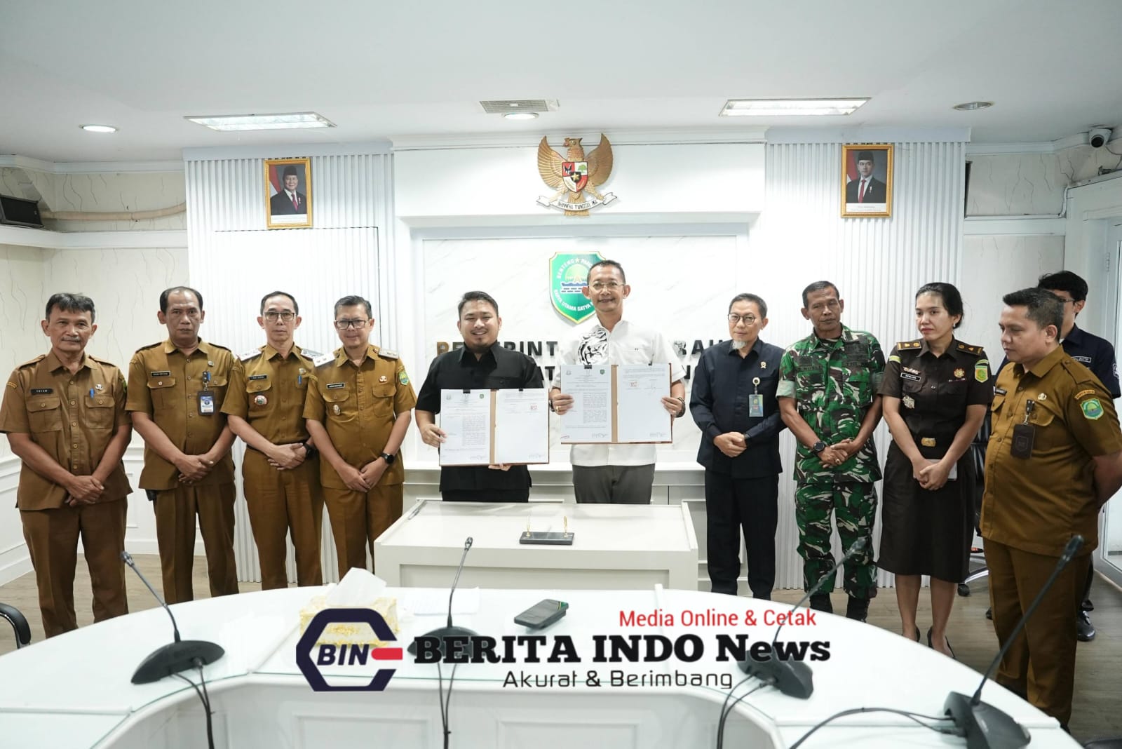 Subang – (BIN) – Bupati Subang Reynaldy Putra Andita BR, S.IP., menghadiri penandatanganan nota kesepahaman (MoU) bersama instansi vertikal, yakni Kodim 0605 Subang, Pengadilan Negeri Subang, dan Kejaksaan Negeri Subang, terkait kerja sama pembangunan serta pemanfaatan media informasi videotron.