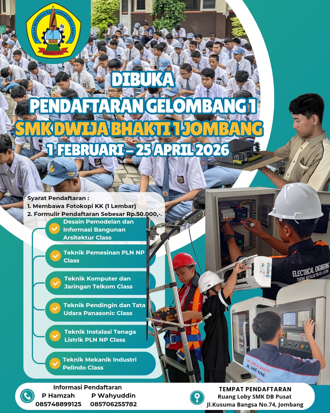 SMK Dwija Bhakti 1 Jombang membuka pendaftaran gelombang 1 dimulai pada 01 Februari 2026 sampai 25 April 2026, bagi para calon siswa pendaftar yang ingin mendaftar dapat membawa persyaratan sebagai berikut: