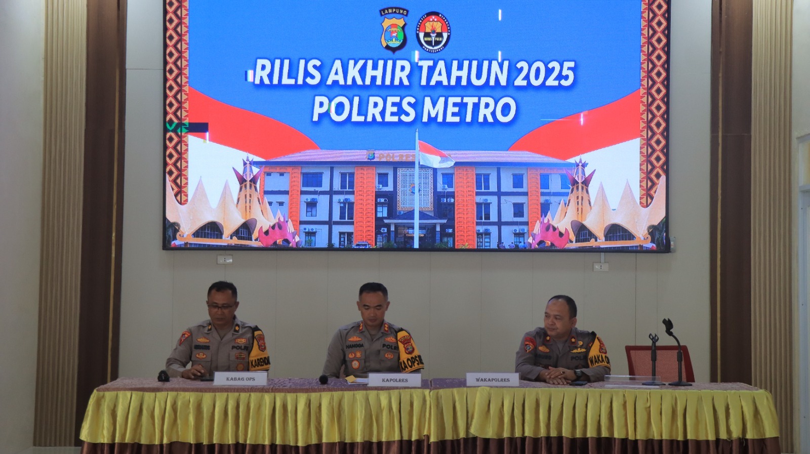 Kota Metro – (BIN) – Polres Metro menggelar kegiatan rilis akhir tahun 2025 pada Rabu, 31 Desember 2025. Kegiatan yang berlangsung di Aula Sanika Satyawadha Polres Metro tersebut dipimpin langsung oleh Kapolres Metro AKBP Hangga Utama Darmawan, S.I.K., serta dihadiri oleh pejabat utama Polres Metro dan rekan-rekan media.