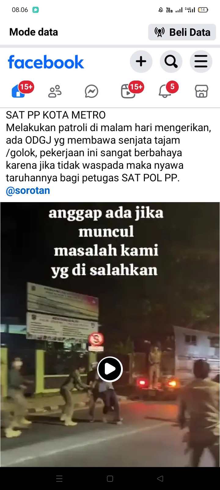 Postingan tersebut dengan judul. “Satpol PP Kota Metro melakukan patroli di malam hari, mengerikan ada ODGJ yang membawa senjata tajam atau golok, pekerjaan ini sangat berbahaya karena jika tidak waspada maka nyawa taruhannya bagi petugas Satpol PP”, tulis Edi Saputra di laman media sosial tersebut.