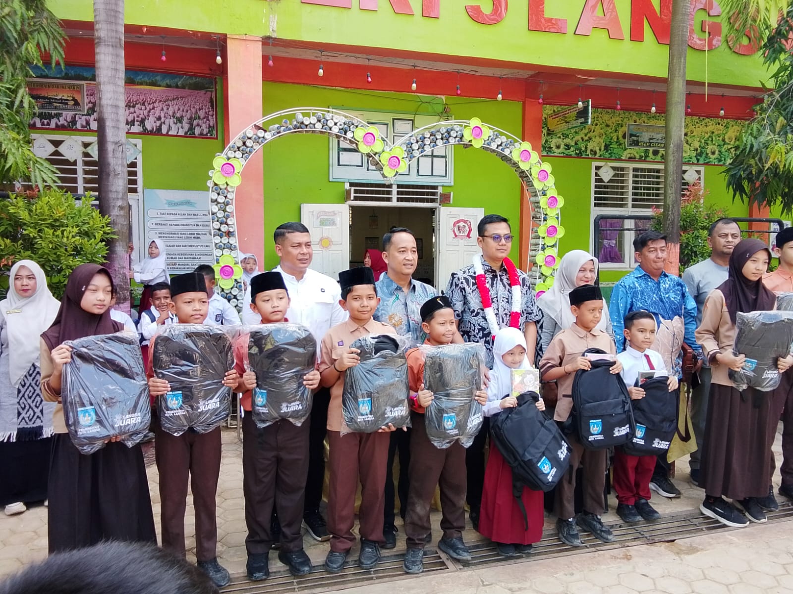 Pada sambutannya, Walikota Langsa Jeffry Santana S Putra SE mengatakan kita membagikan bantuan pasca banjir untuk SD, dan nantinya setelah ini kita akan serahkan bantuan untuk siswa SMP, namun bantuannya bertahap dalam bentuk tas sekolah dan buku sekolah buku tulis, jadi pasca banjir kemarin tasnya pada rusak.