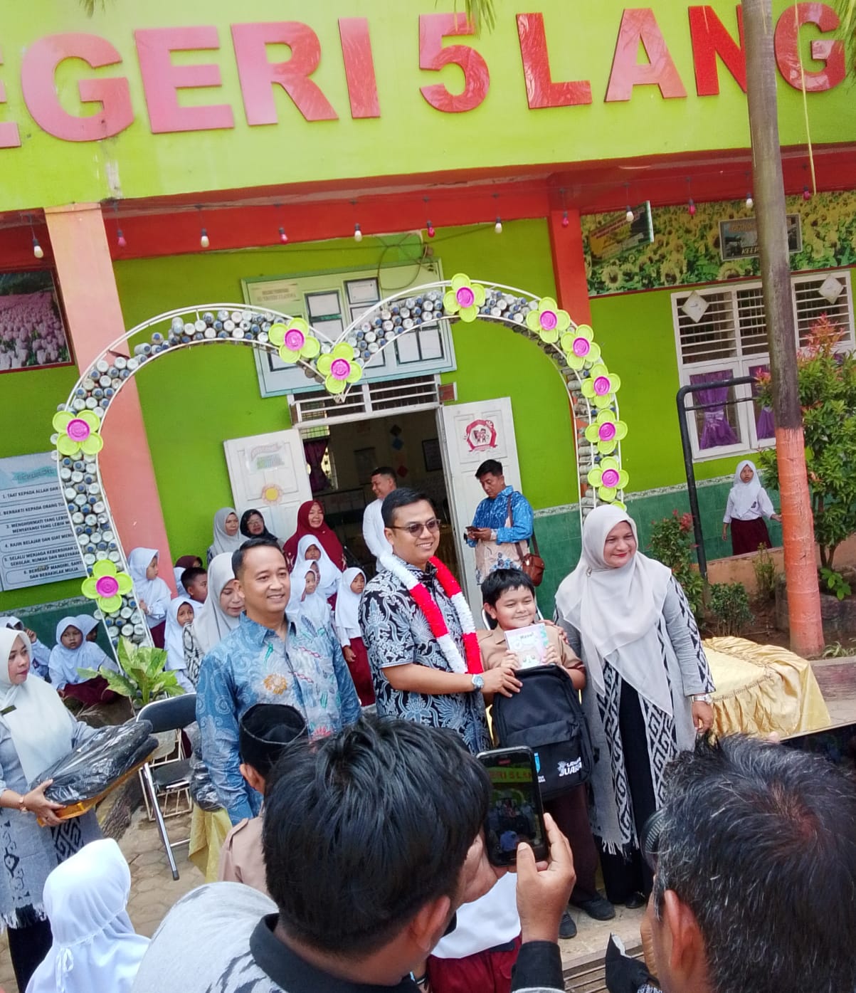 Walikota Langsa Jeffry Santana S Putra SE, di sambut kalung bunga merah putih disandangkan oleh kepala SD Negeri 5 Langsa, Kasmawati, SP.d. saat turun dari mobil dinasnya. Sebelum datang walikota Langsa puluhan siswa SDN 5 berbaris rapi dan bersiap sambut datangnya walikota Langsa.