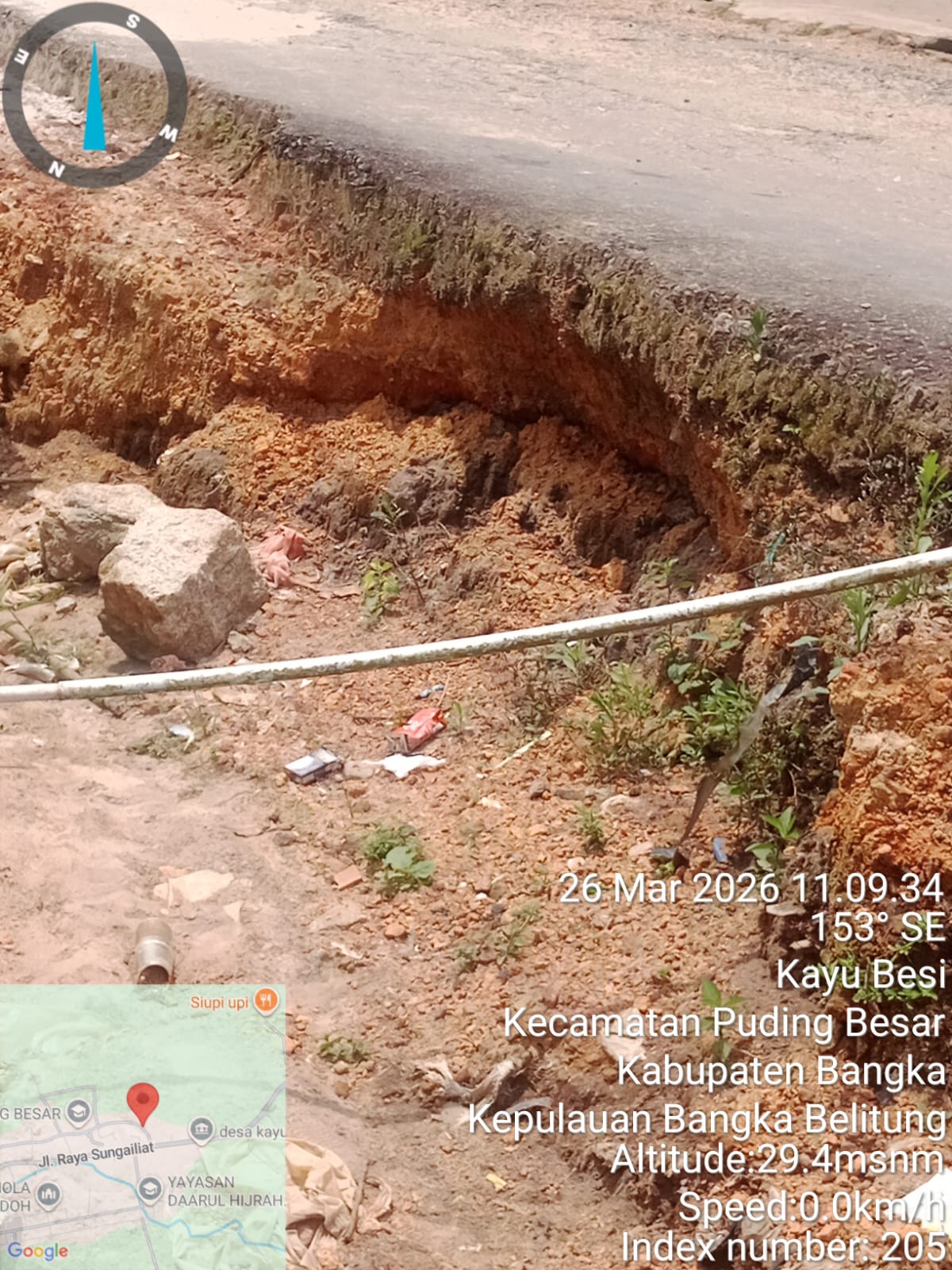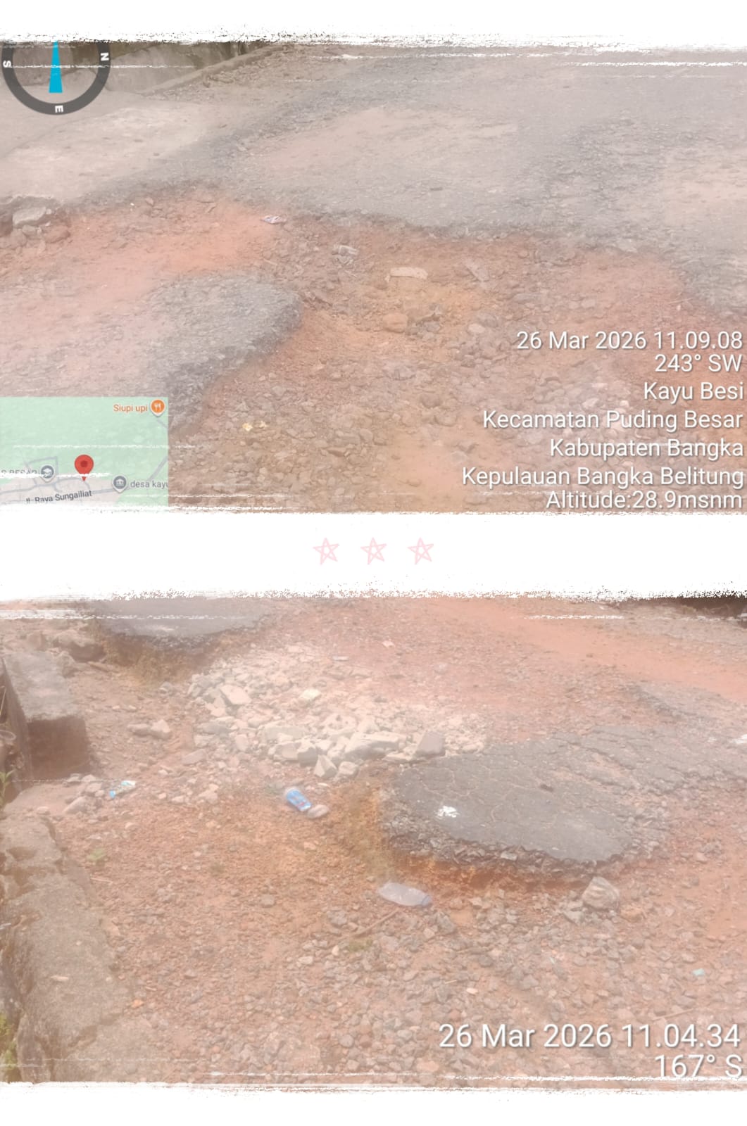 Bangka – (BIN) – Warga RT 01 Gang Rantau, Desa Kayu Besi, Kecamatan Puding Besar, Kabupaten Bangka, mengeluhkan kondisi jalan lingkar desa yang mengalami kerusakan parah dan hingga kini belum mendapat perbaikan dari pemerintah kabupaten.